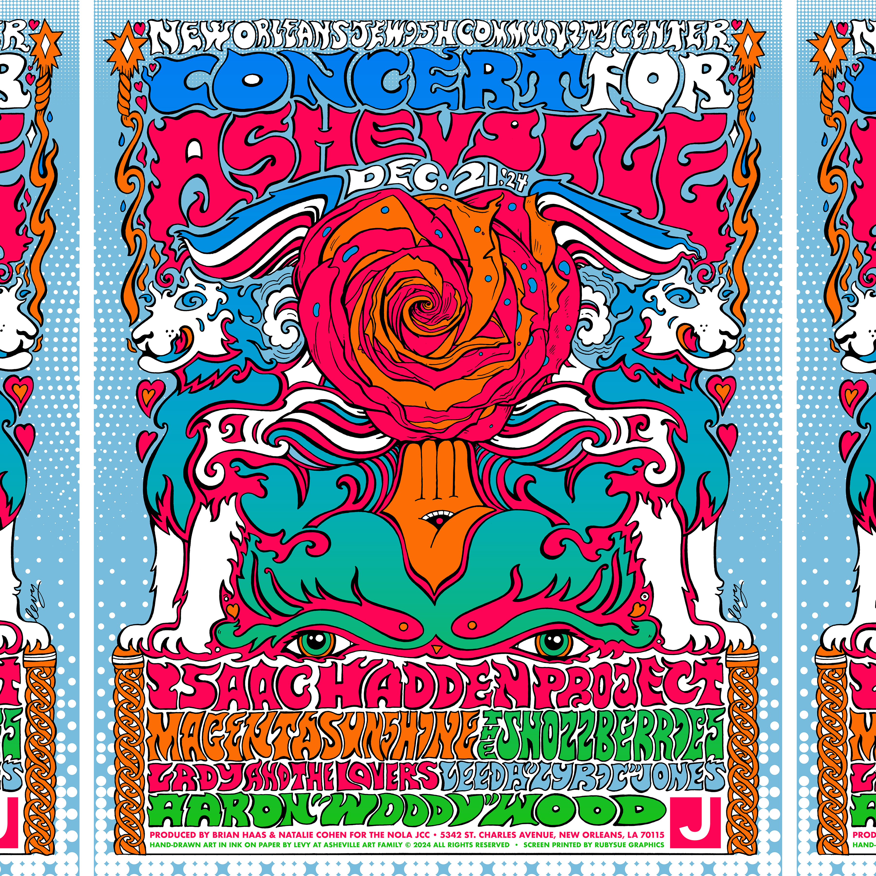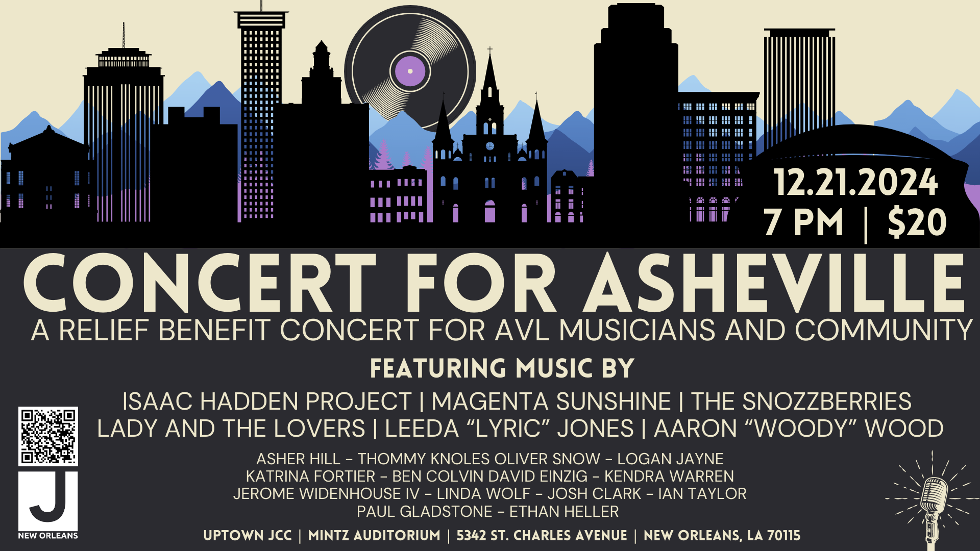 Welcome to the Concert for Asheville! Join us on Saturday, December 21, 2024 at 7:00 PM in the New Orleans JCC - Mintz Auditorium for a night of music, community, and support. Let's come together to raise funds for those affected by the recent disaster in Asheville. Enjoy live performances from the best and brightest of Asheville's diverse music scene.
